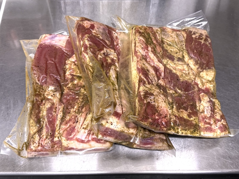 道産豚(銘柄豚/ブランド豚)のバラ肉を使ってベーコンを作る。