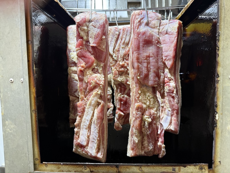 表面の塩分を流水で洗い流し、水分を拭き取りスモーカーに吊るして乾燥工程に入る。