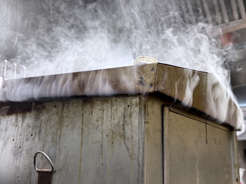 スモーク後はまだ中心が生の状態なので、低温でゆっくりと加熱殺菌をする。