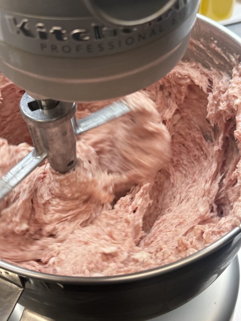 そして、香辛料と塩で味付けし肉の粘りが出るまでしっかりと練り上げます。