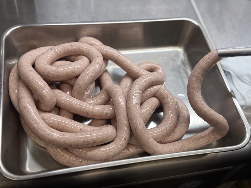 次に、羊の腸へ一本一本、空気を抜きながら詰めていきます。