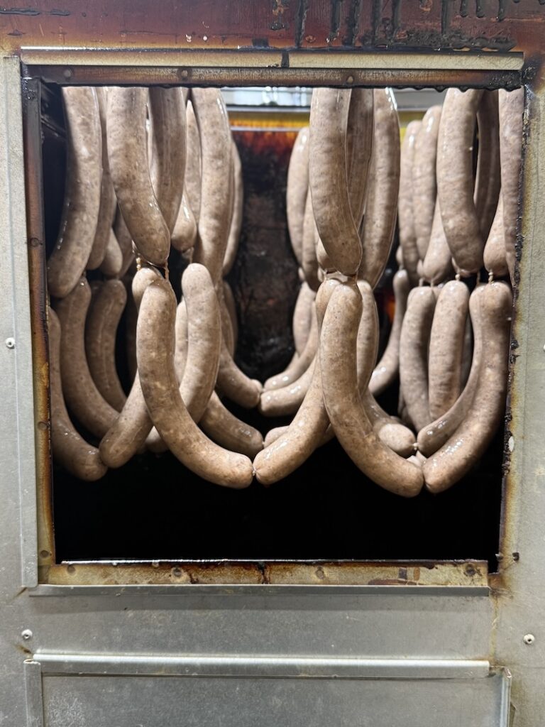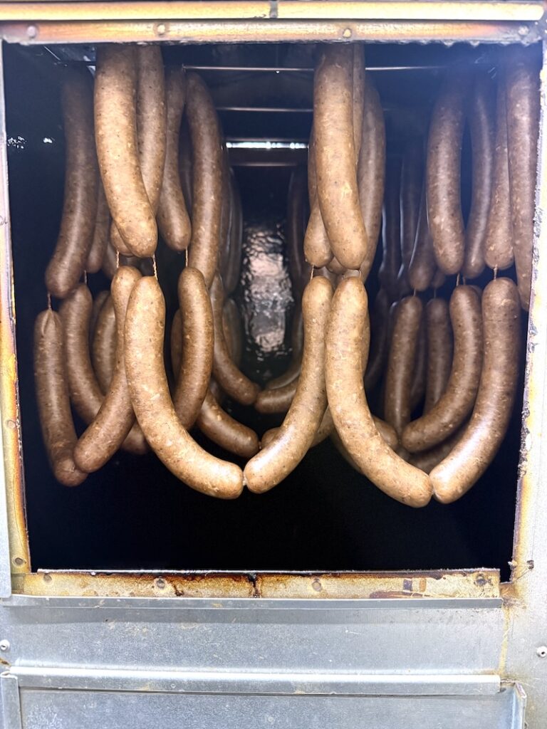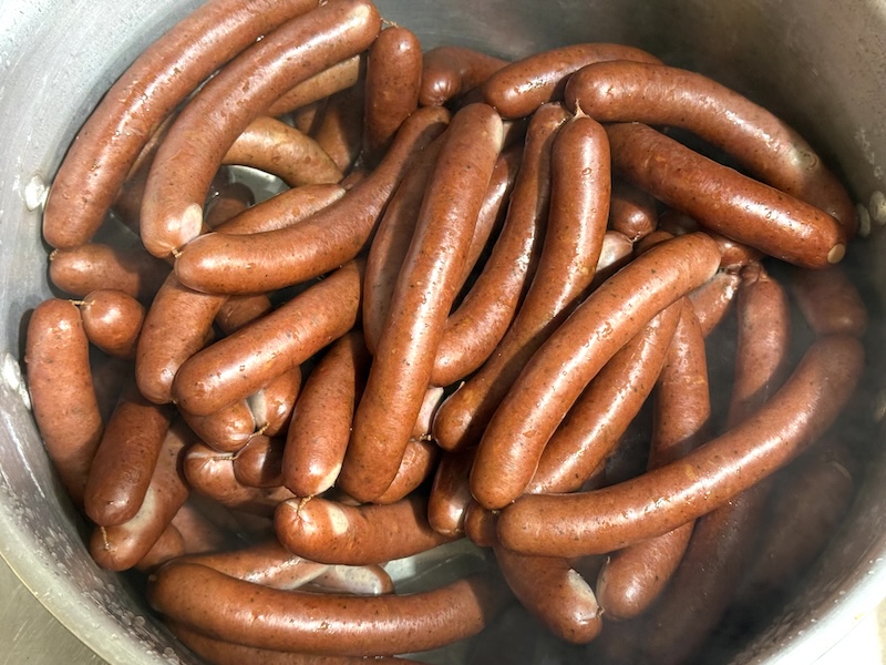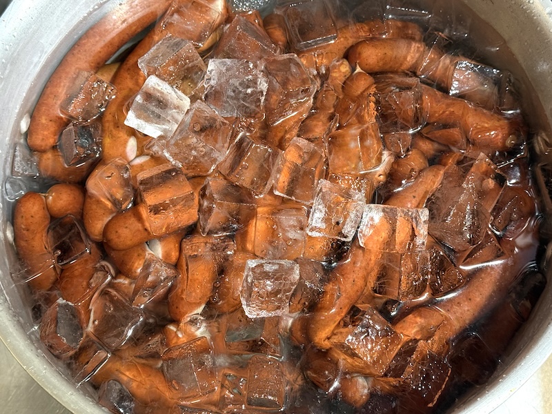 燻しあげたソーセージを、次は低温でゆっくりと火入れします。