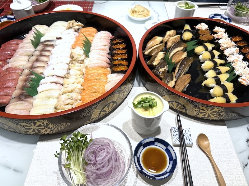 マグロ、マスノスケ、自家製の煮穴子と〆さば、真つぶ、数の子、蟹…