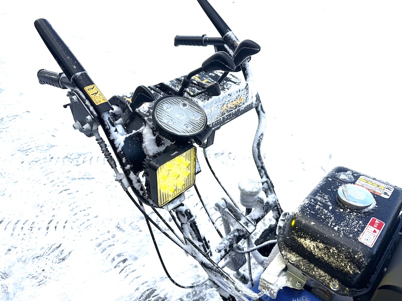 (上に載せているのが壊れた純正ライト)昨日降った雪を除雪した後で除雪機が雪だらけ。