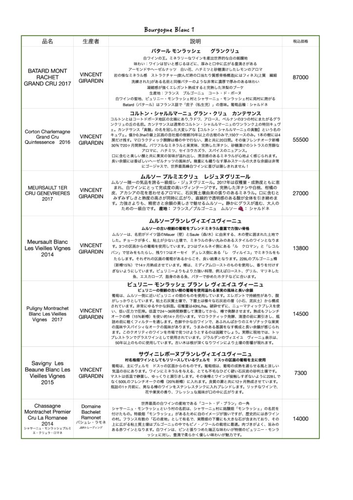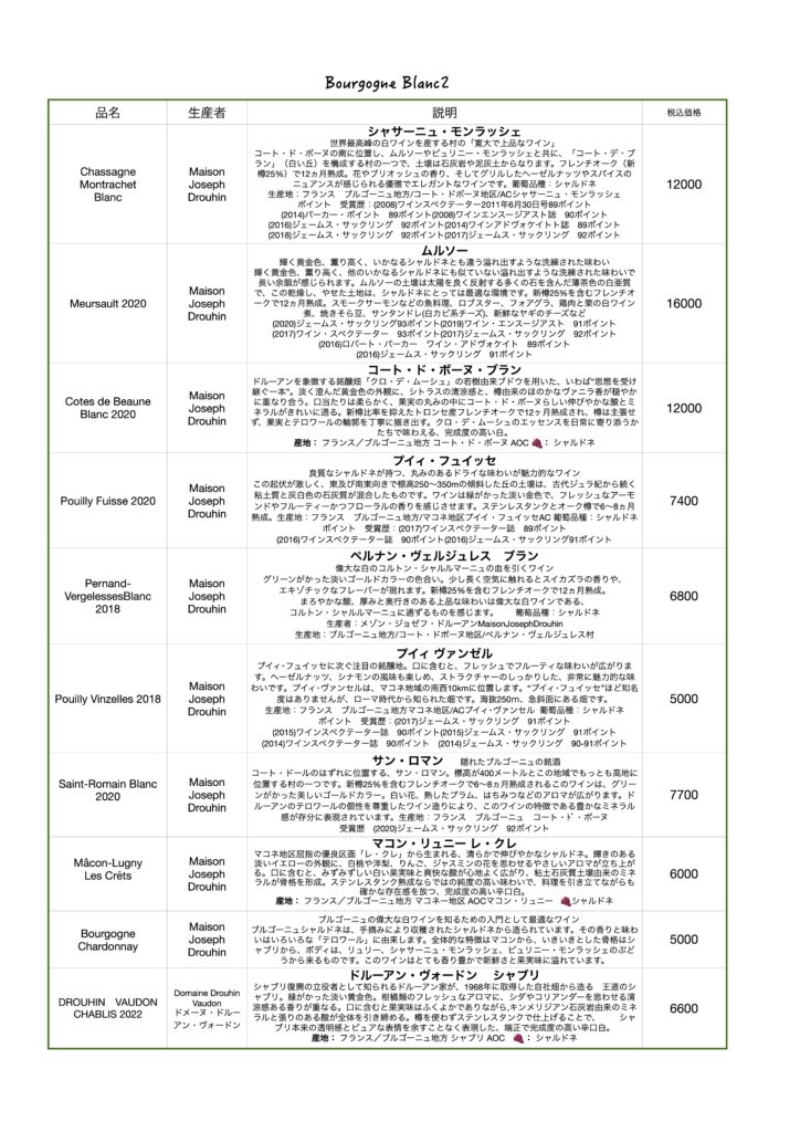 当店のワインリスト、ブルゴーニュ白ワインになります。当店のワインリスト、ブルゴーニュ白ワインになります。