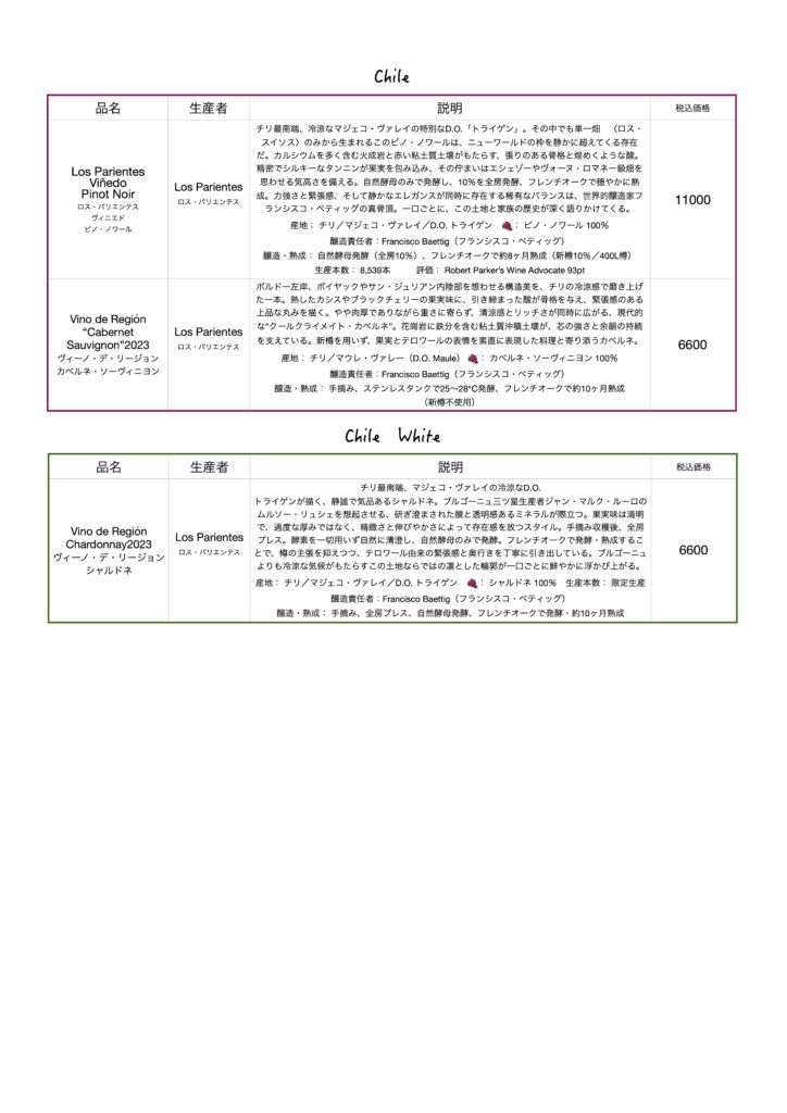 当店のワインリスト、チリワインになります。当店のワインリスト、チリワインになります。