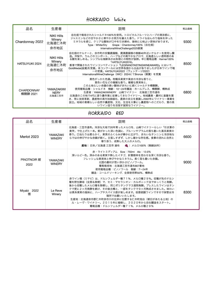 当店のワインリスト、北海道ワインの白&ロゼ&赤。当店のワインリスト、北海道ワインの白&ロゼ&赤。