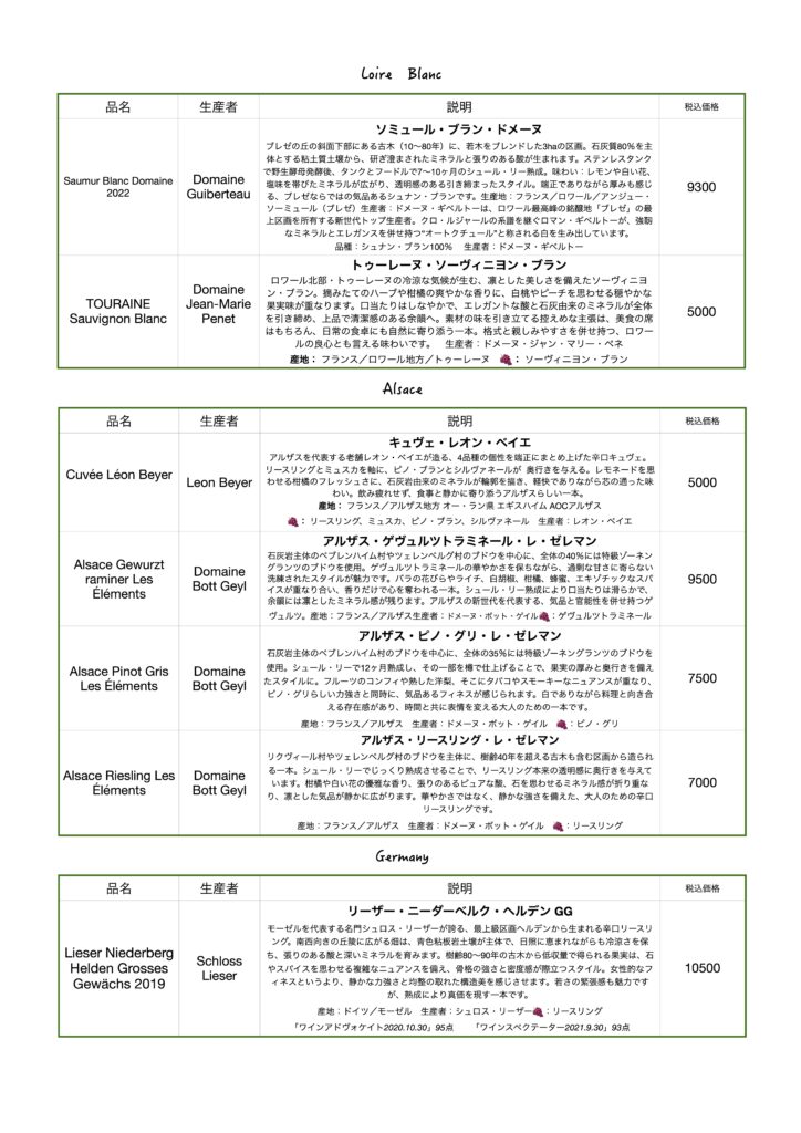 当店のワインリスト、『ロワール・アルザス・ドイツ』の白ワイン。当店のワインリスト、『ロワール・アルザス・ドイツ』の白ワイン。