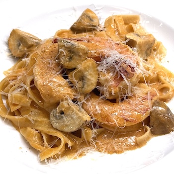 大きめの海老・マッシュルーム・濃厚なトマトクリームソースが、タリアテッレに絡む贅沢な一皿。