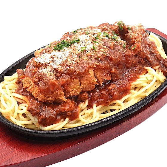 その揚げたてのとんかつを、 旨味を幾層にも重ねて煮込んだ特製ミートソースをたっぷり絡めたスパゲッティの上に豪快にトッピング。 熱々の鉄皿でご提供し、仕上げに粉チーズとパセリを散らしています。