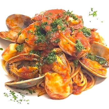 『海老・帆立貝・牡蠣・いか・あさり』素材はメイン級。魚介の旨みを丸ごと味わう贅沢なスパゲッティ。
