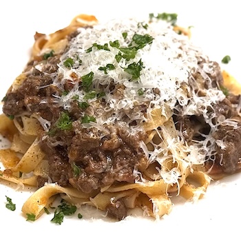 斜里産蝦夷鹿の赤身肉を丁寧に挽き、香味野菜と赤ワインでじっくりと煮込んだ、深みのあるボロネーゼ。